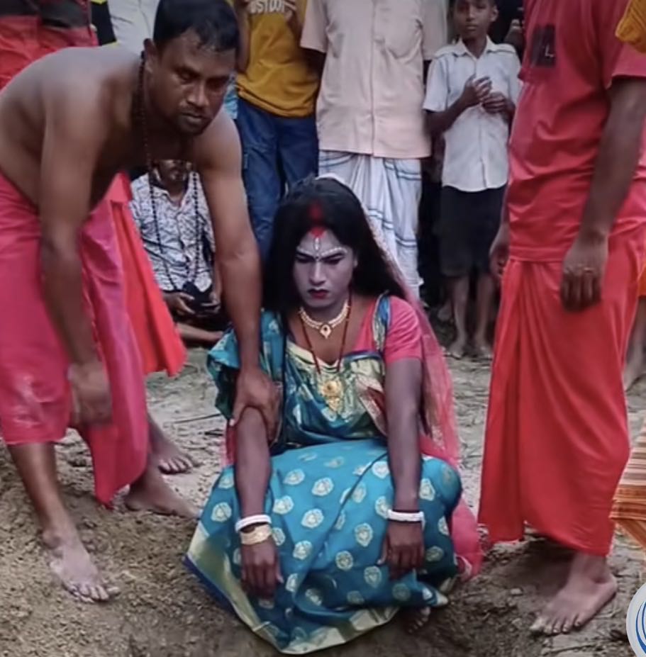 男扮女神,印度教中,卡莉等女神是力量、毁灭与重生的象征,“埋入地下”被视为“与大地母亲融合、完成死亡与重生的循环”,以此洗清罪孽、获得新生。就是一个仪式,一般就埋一分钟,再录长一点就坐起来了