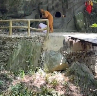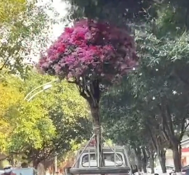 保洁阿姨一脸疑惑的看着绿化树