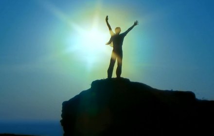 阳光下 站在巨石上的男人剪影